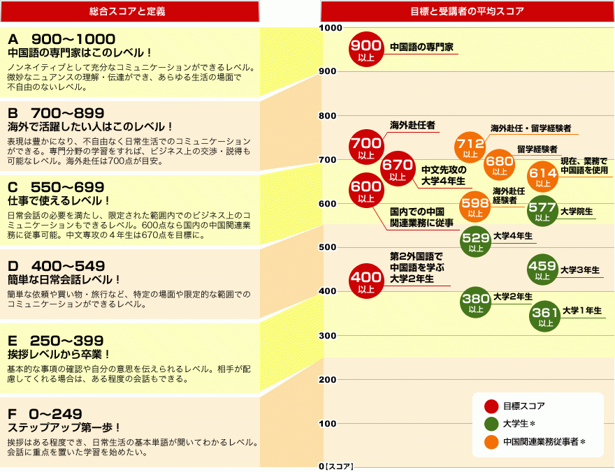 「○級」っていう試験区分は無くて、スコアで評価します。